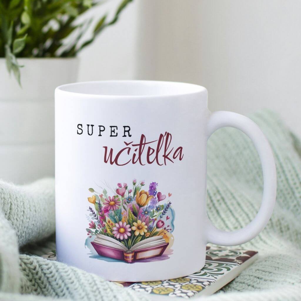 Biely hrnček pre učiteľku s potlačou