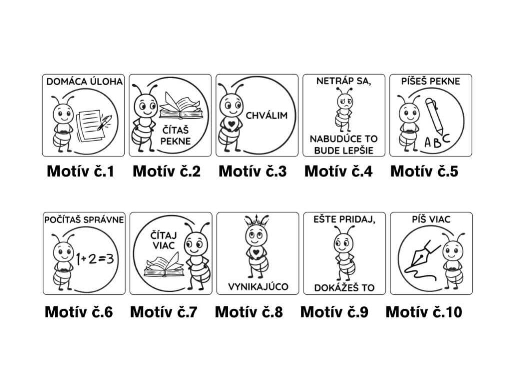✅ pečiatka je zložená z obrázku a textu, ktorým učiteľka hodnotí žiaka