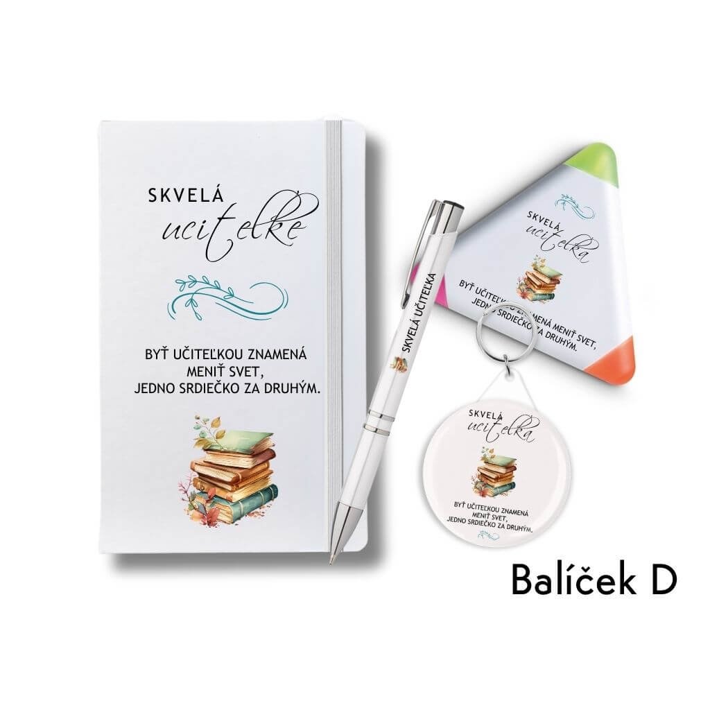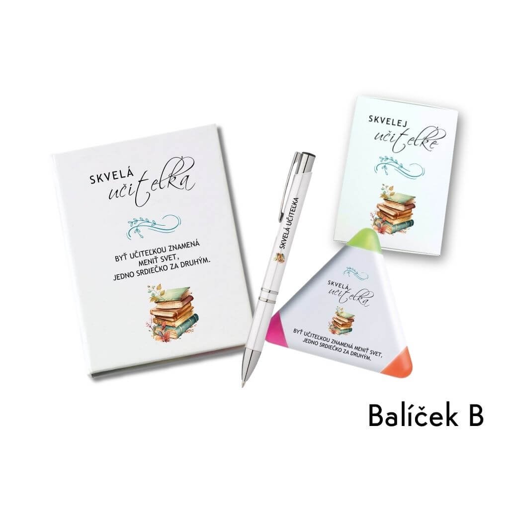 ✅ balíček B: sada samolepiacich papierikov, pero, zvýrazňovač, darčeková krabička s potlačou